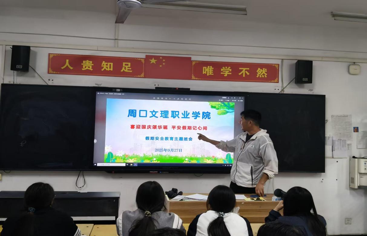 为切实保障学生十一假期期间的人身与财产安全,进一步强化学生安全防范意识和责任担当,2025年9月27日,学生科组织各二级学院辅导员在班内组织召开十一假期安全主题班会。