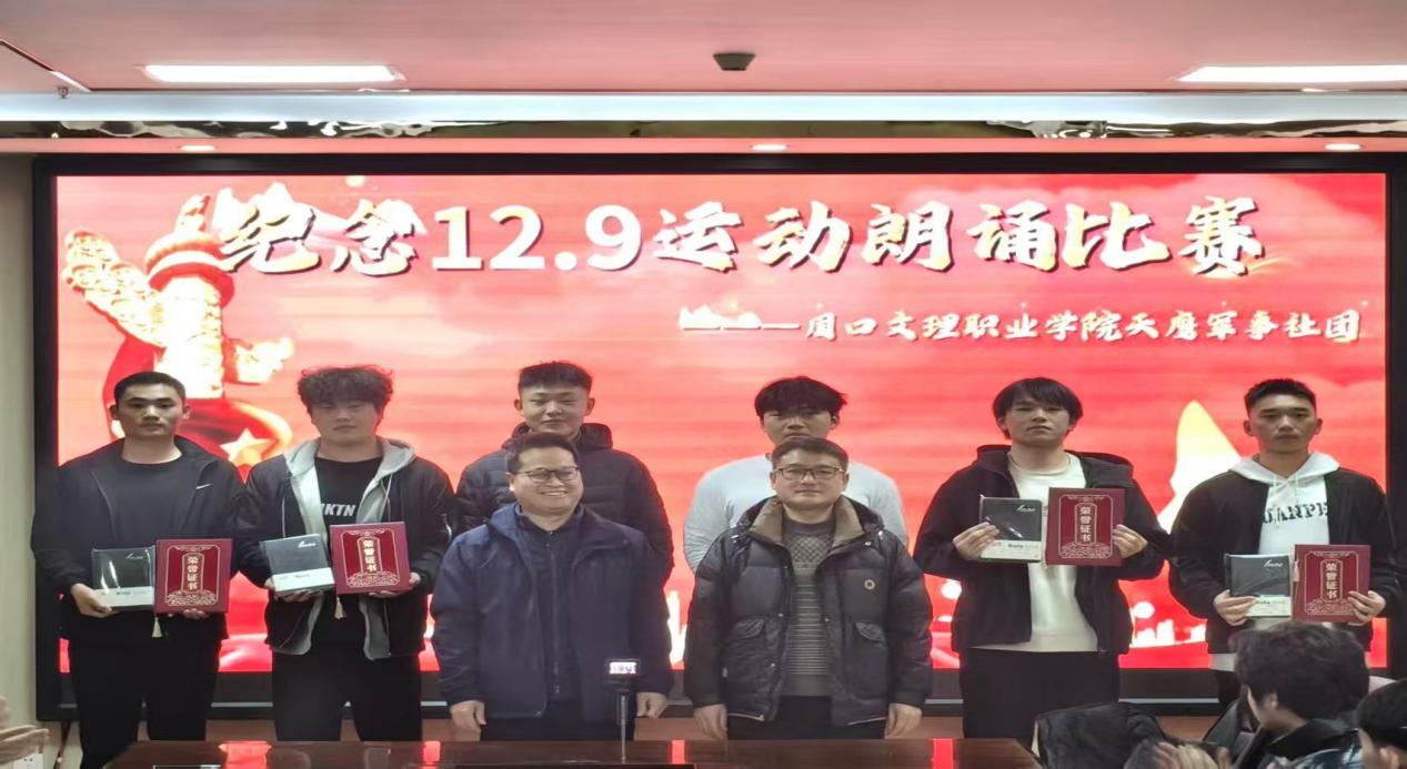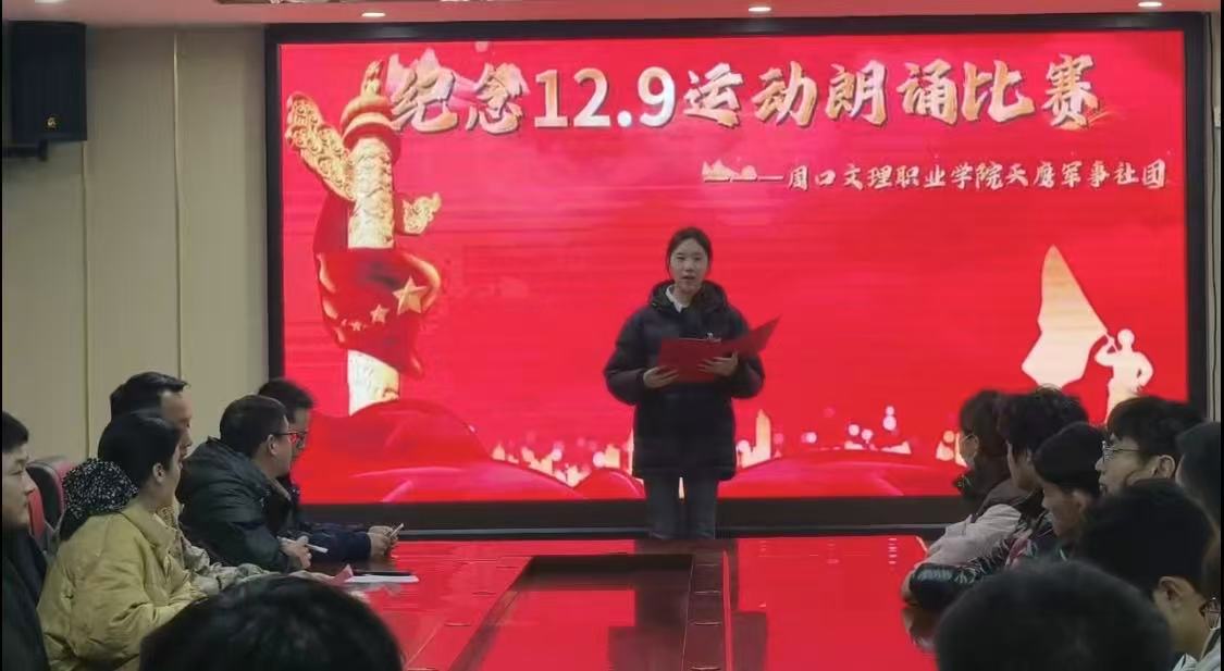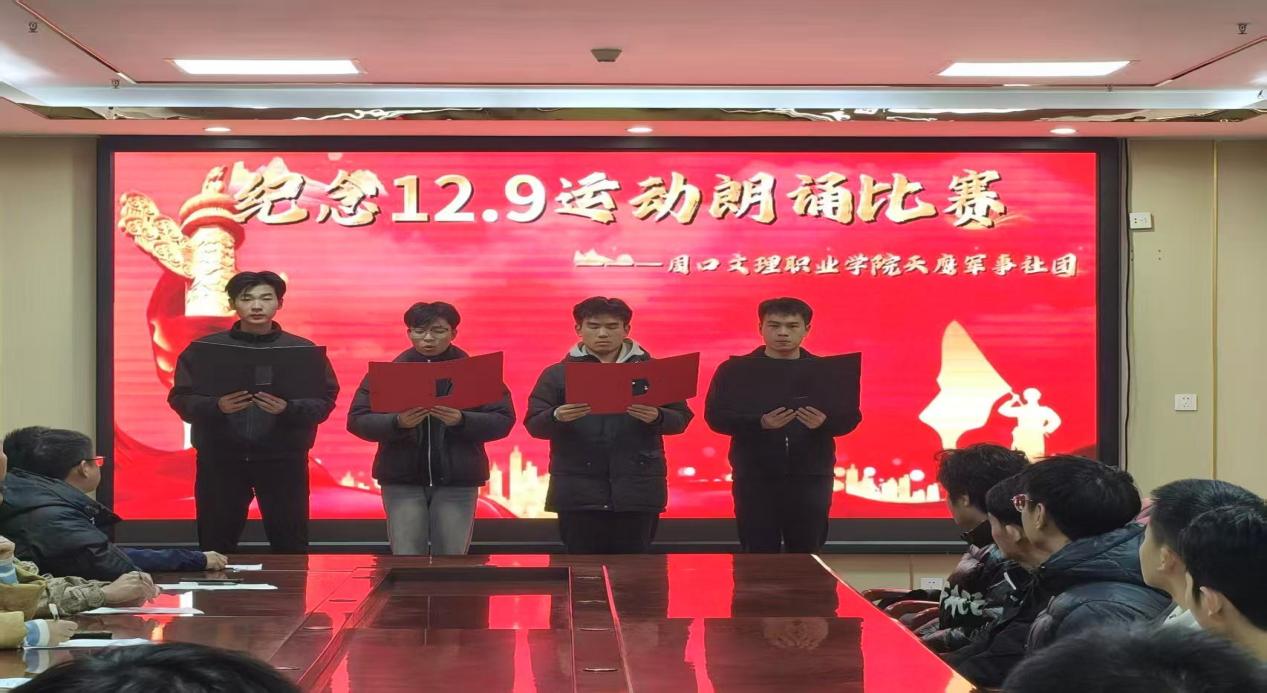 为深化国防教育,传承红色基因,纪念“一二·九”运动九十周年,12月9日晚,周口文理职业学院在办公楼512会议室举办“强军之声·青春之诵”天鹰军事社团国防教育主题朗诵会。活动由学校人民武装部主办,天鹰军事社团承办,学校武装部部长、学生科科长、团委书记、资助中心主任、军事社团全体成员及部分学生代表参加。