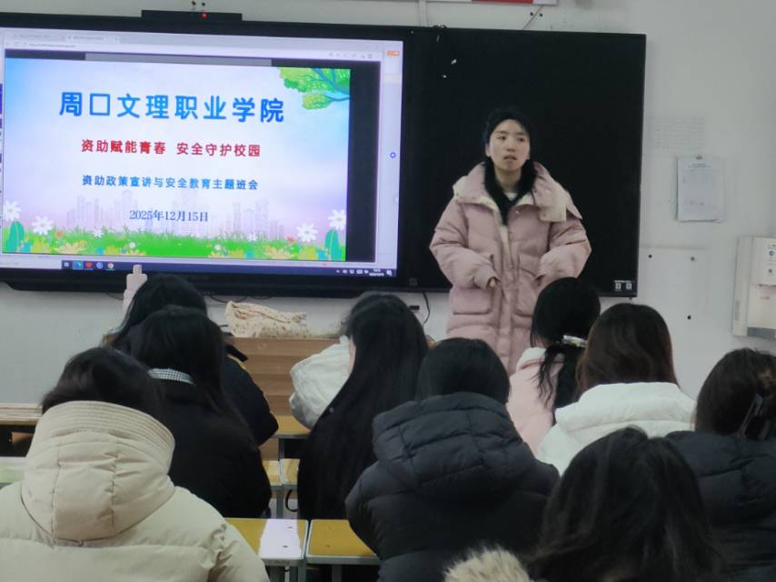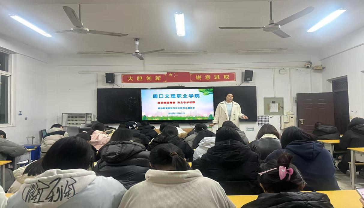 为切实落实国家资助政策,筑牢学生安全防线,2025年12月15日,周口文理职业学院学生科组织各二级学院班级开展资助政策两节课宣讲与安全教育主题班会,全体学生参与此次班会。
